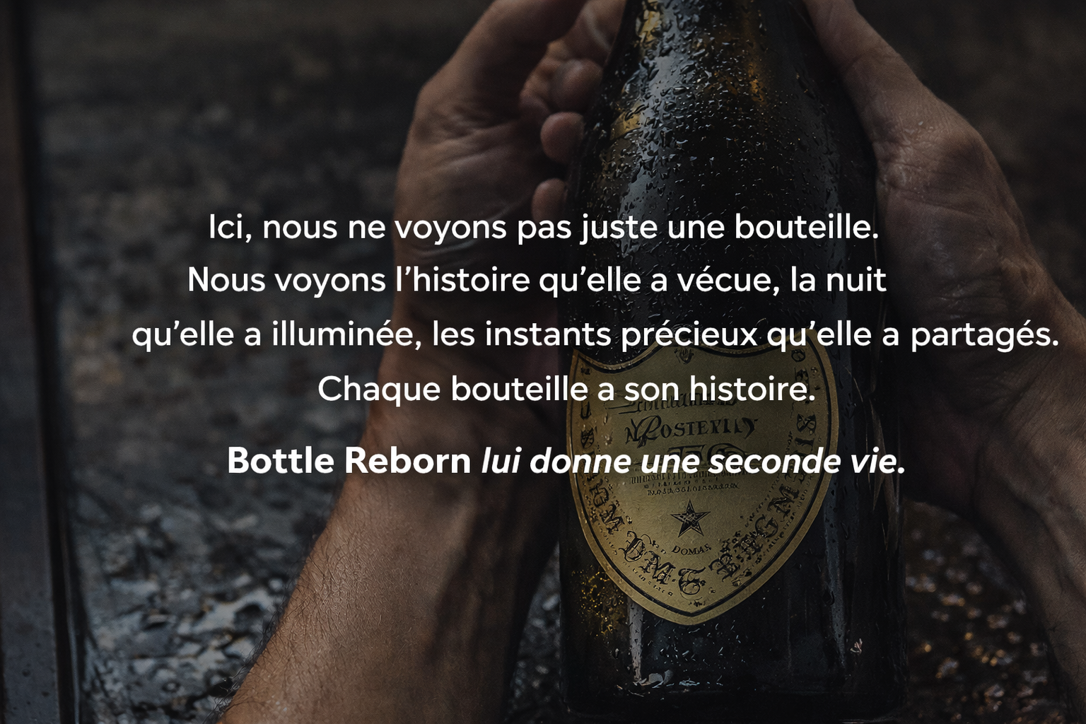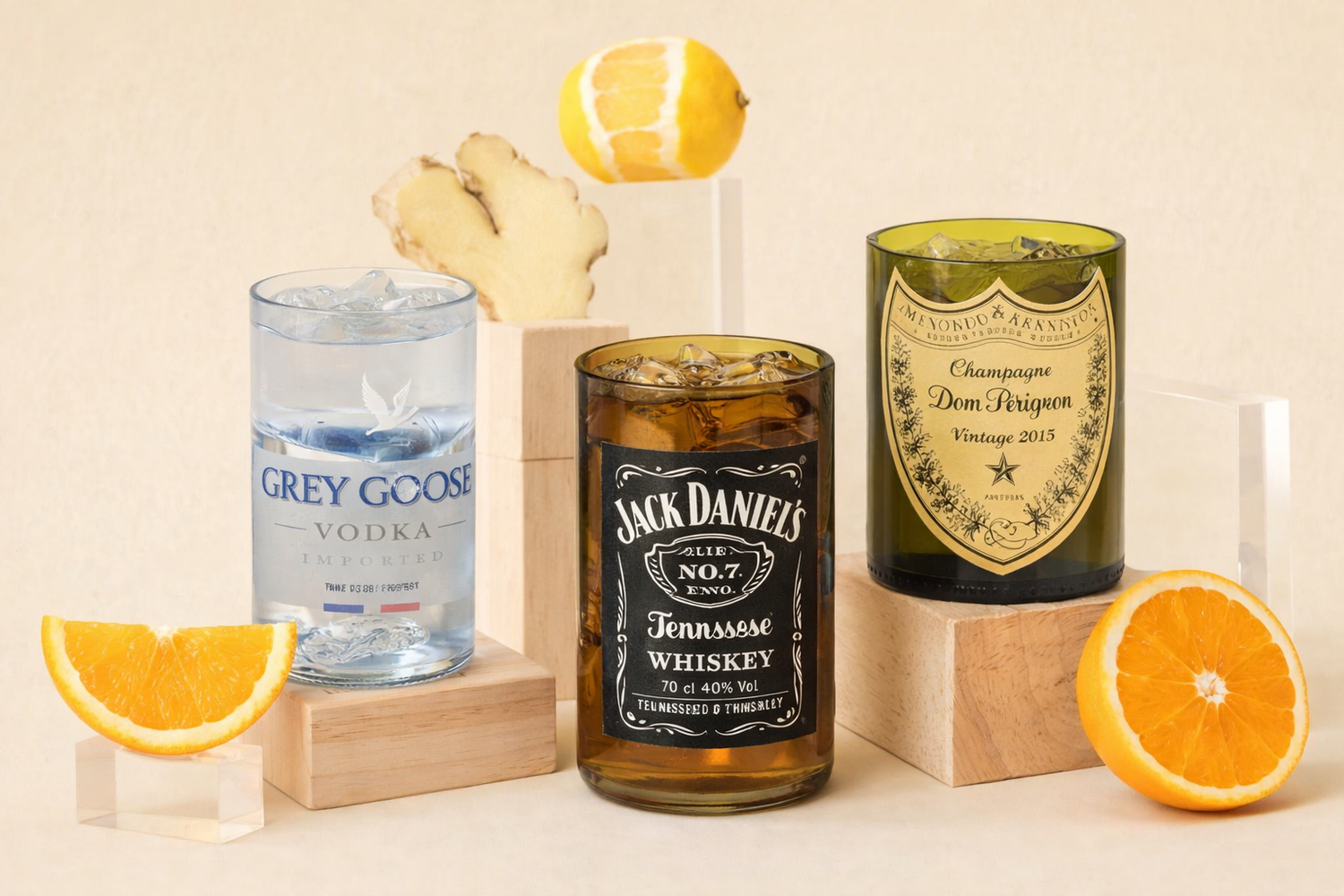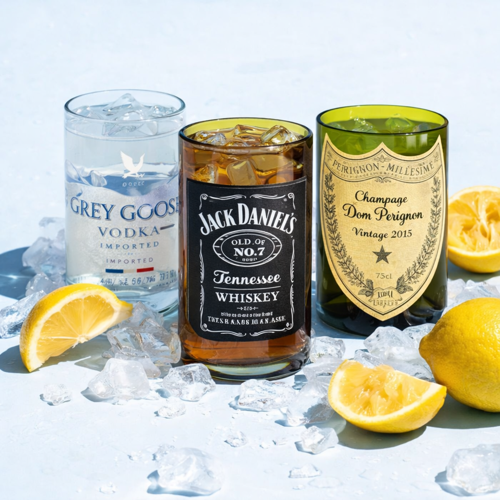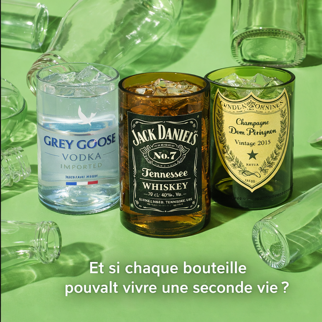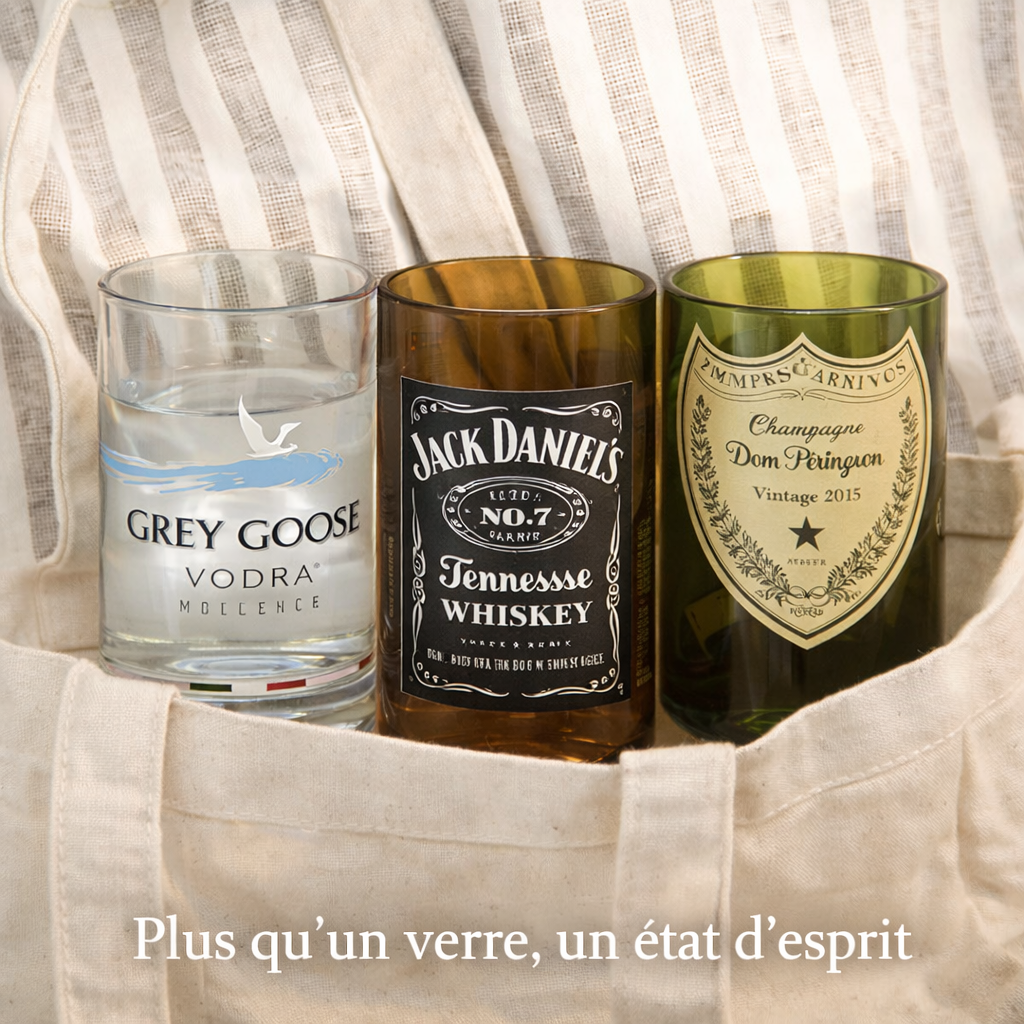 Nous récupérons des bouteilles mythiques comme Dom Pérignon, Jack Daniel’s ou Grey Goose pour leur donner une seconde vie, en les transformant en verres uniques au design brut et élégant.